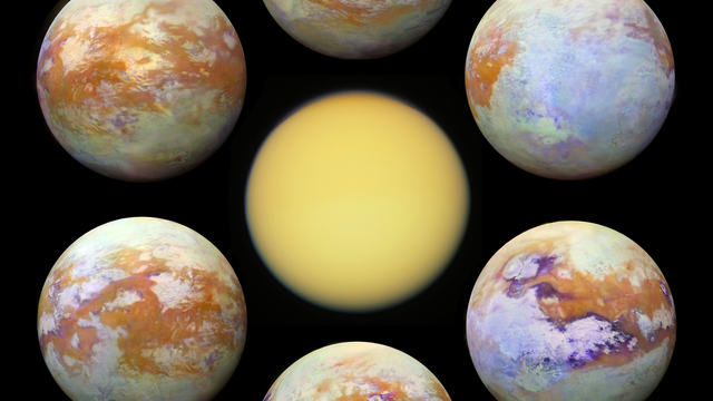 Abaixo, está a foto de Titã na luz visível ao centro, rodeada por capturas da lua na luz infravermelha: