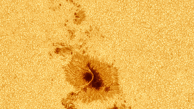 Na imagem, há uma mancha solar maior que as demais: se você observá-la bem, vai ver que ela tem um filamento brilhante e material gasoso suspenso. Quando surgem, as manchas se expandem e se contraem enquanto se movem pela superfície solar.