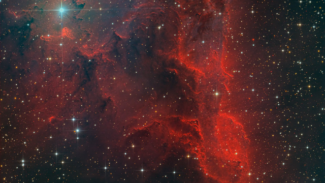 Encontrada a cerca 5 mil anos-luz de distância, esta nuvem de hidrogênio gasoso e brilhante tem brilho bem fraco.